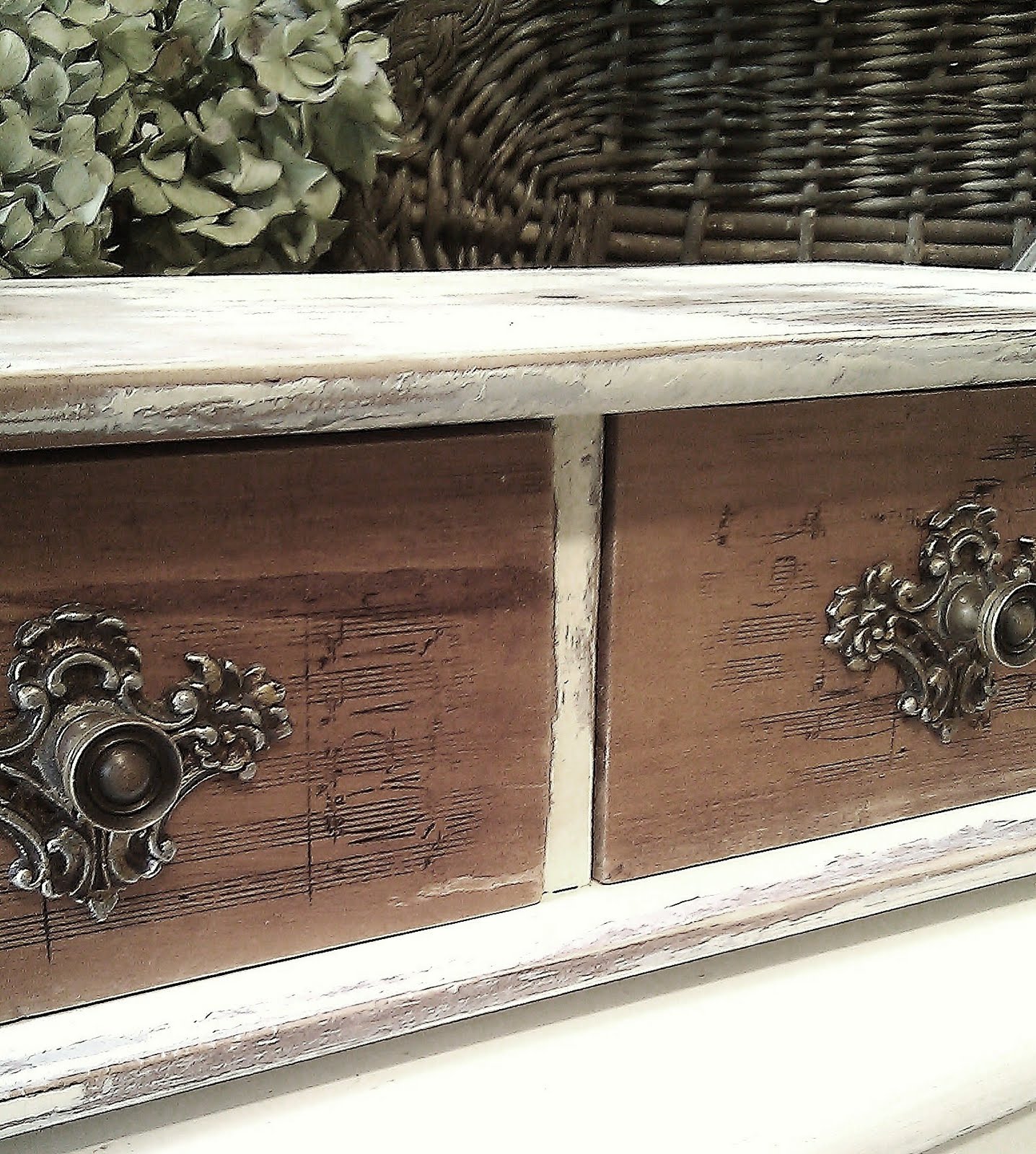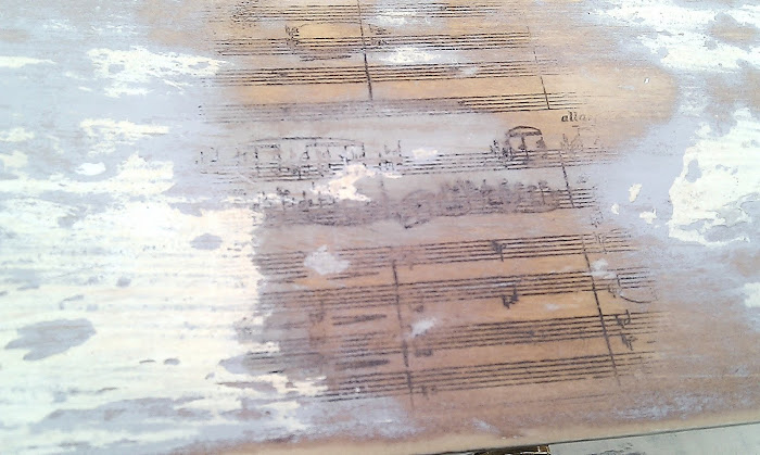 So, I changed my intention from slightly to heavily distressed. I also decided to add and a little musical touch. I transferred small segments of sheet music to the drawers,